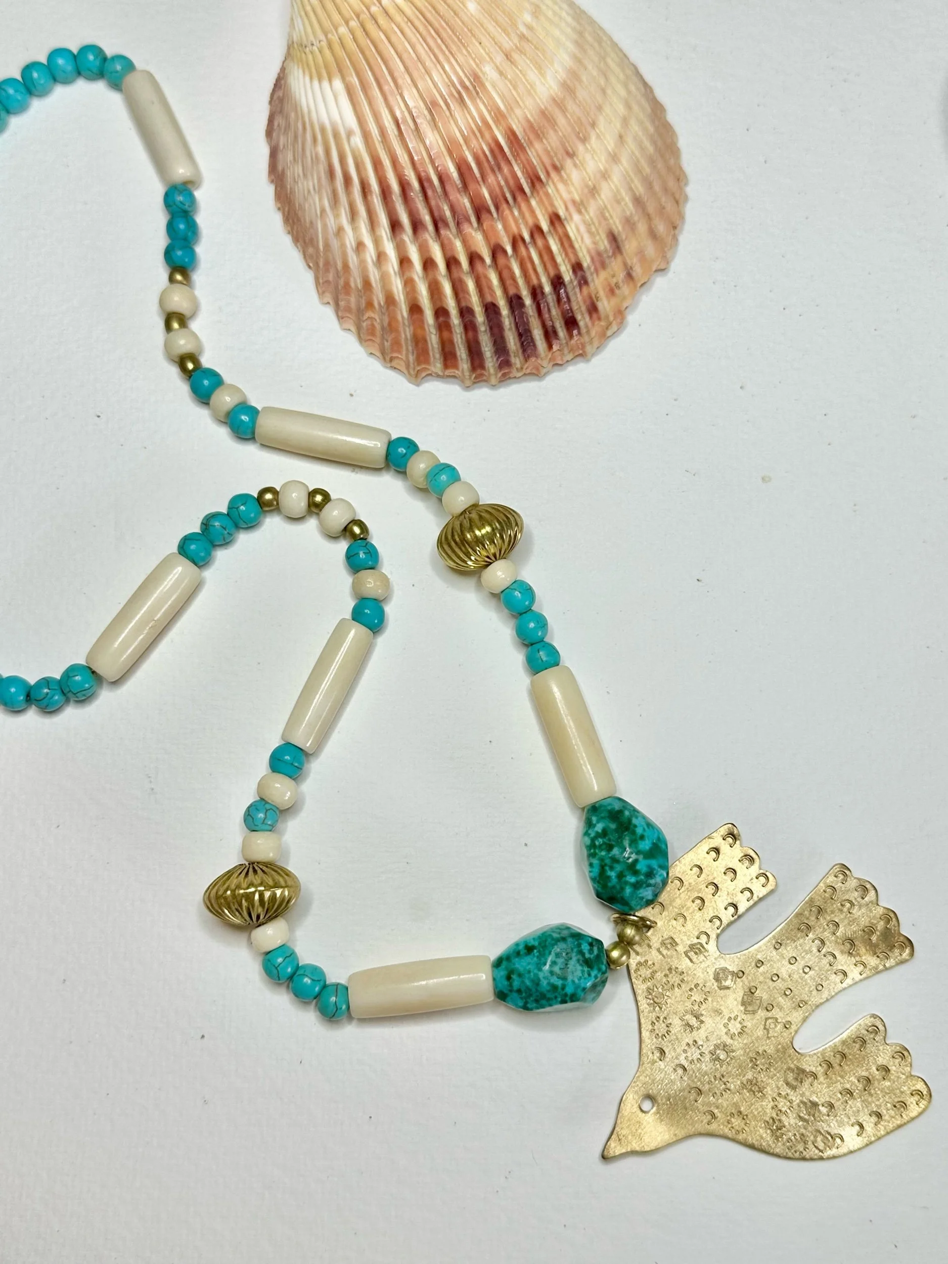 A unique one off beaded necklace made from repurposed and howlite turquoise beads. With a handmade brass folk style bird pendant