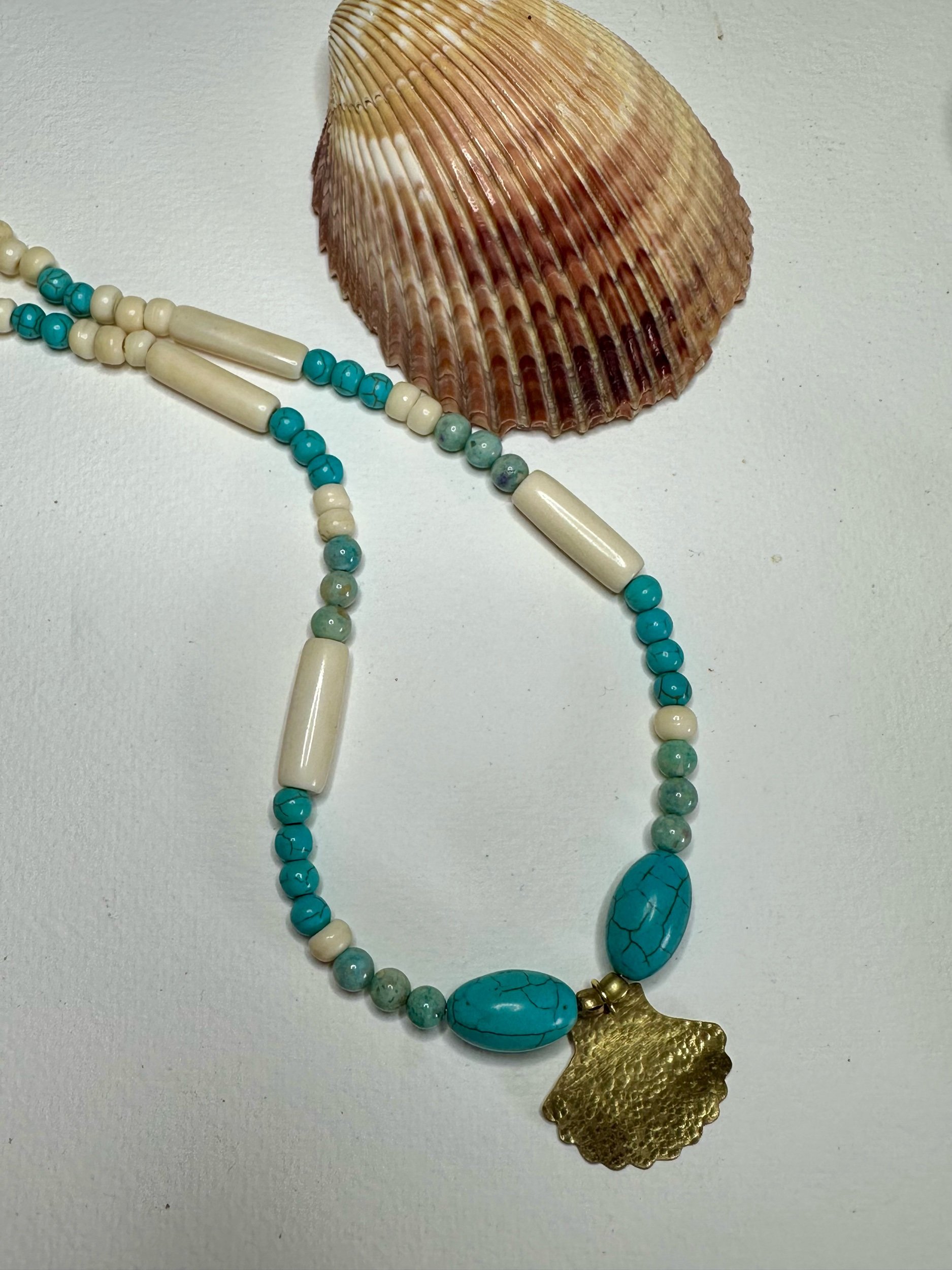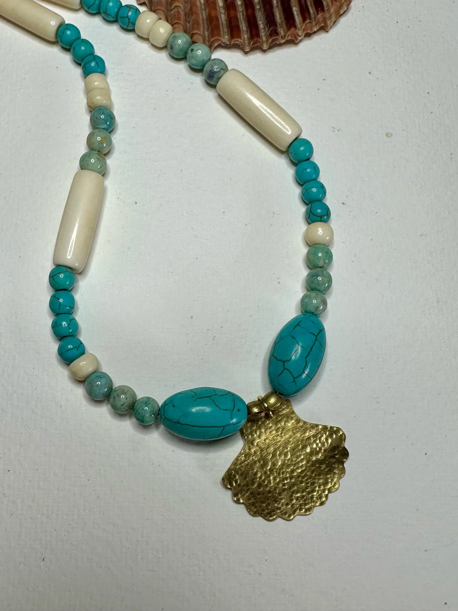 A unique one off beaded necklace made from repurposed, howlite turquoise and semi precious beads. With a handmade brass hammered textured shell pendant